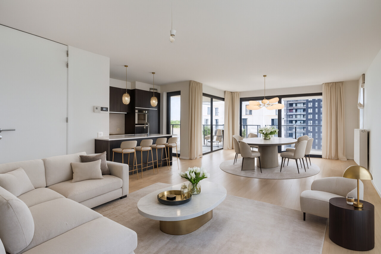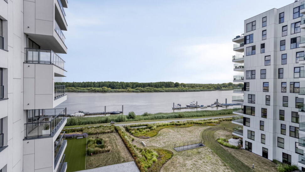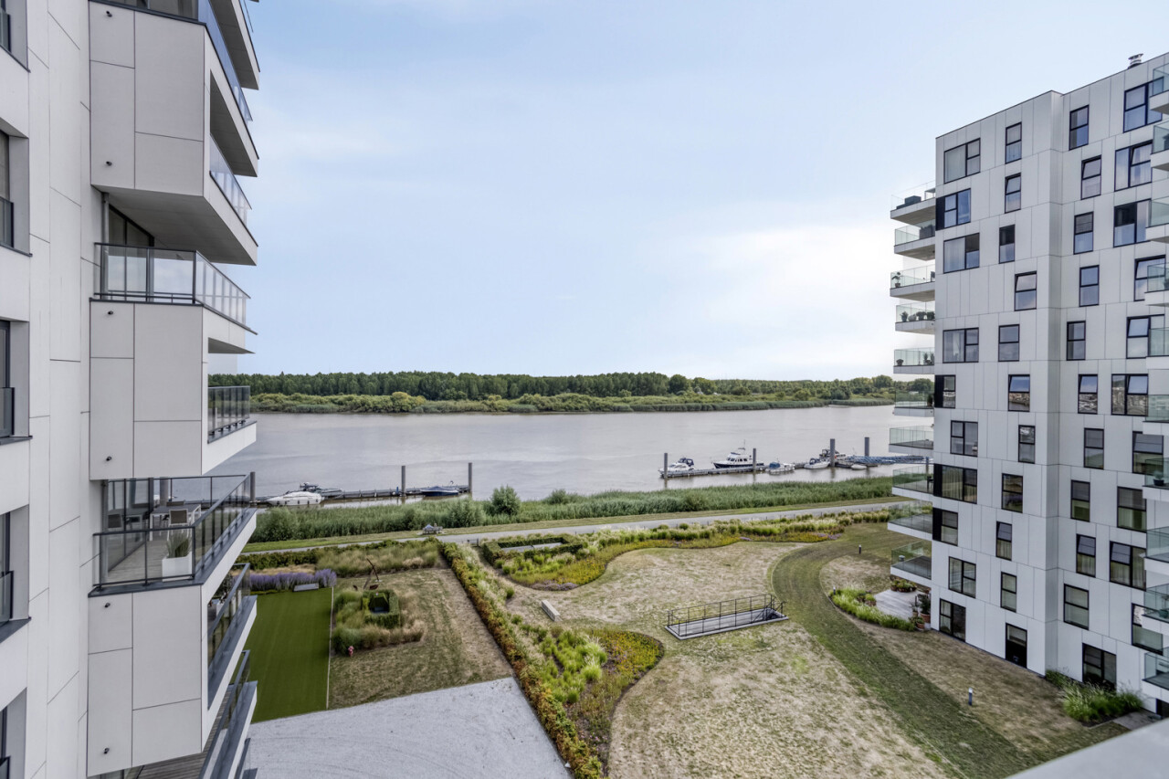De leefruimte is licht en open, met een hoogwaardige parketvloer en grote raampartijen die zorgen voor een adembenemend zicht op de Schelde.