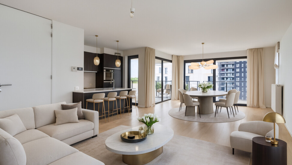 De open keuken is volledig geïntegreerd in de leefruimte.