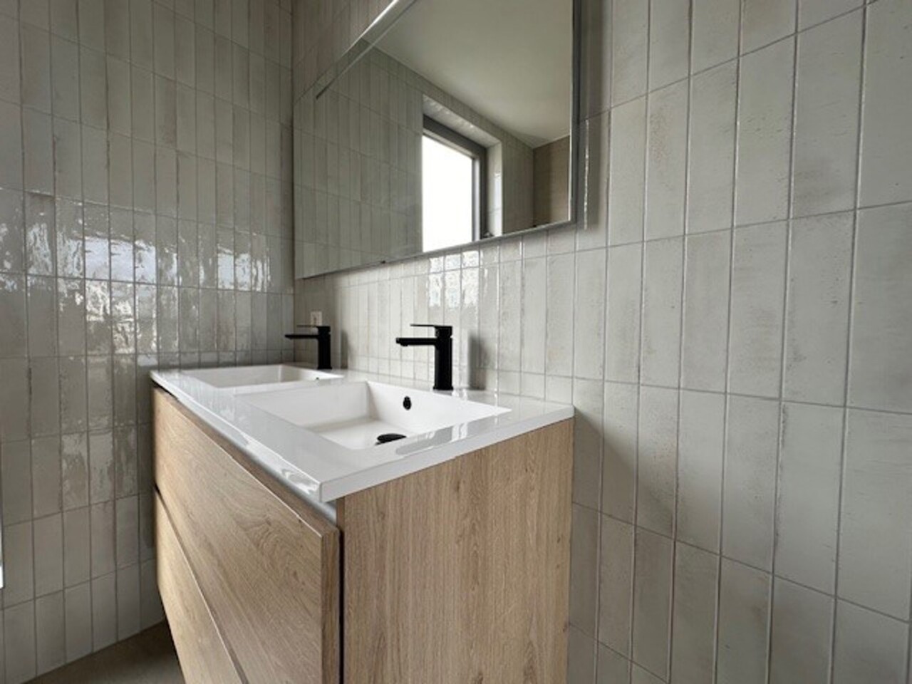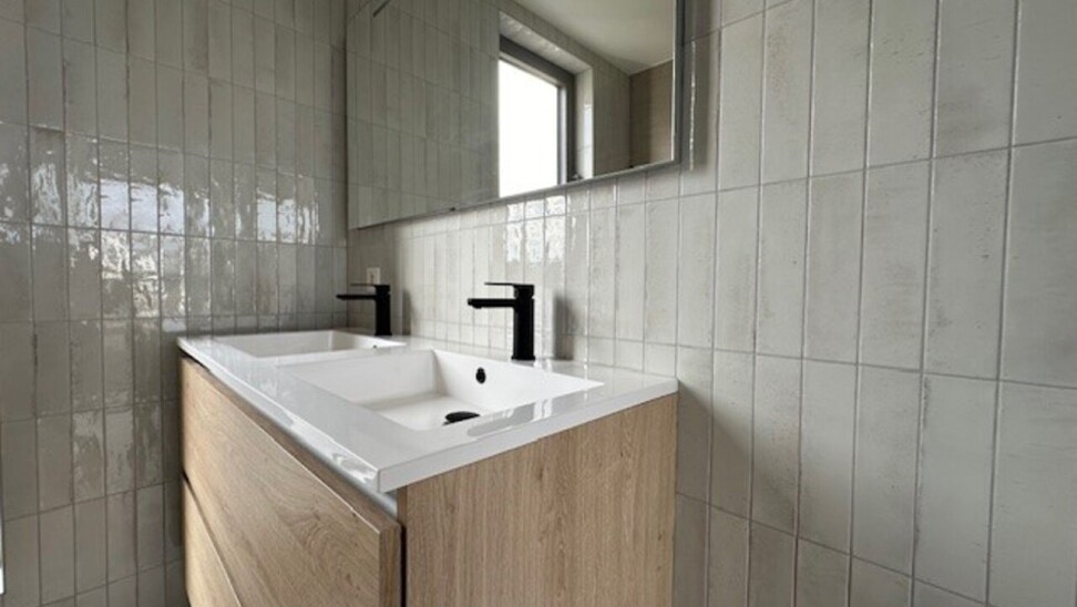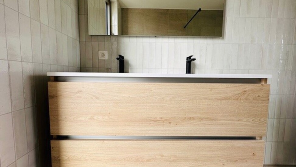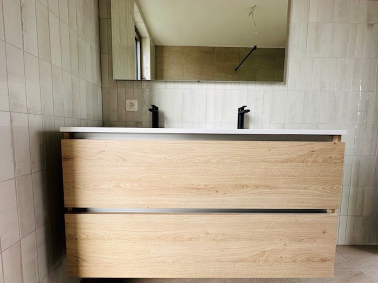 Badkamer wordt voorzien van een badkamermeubel met dubbele wastafel, douchebak met glazen douchewand