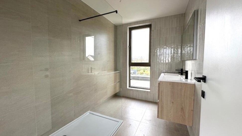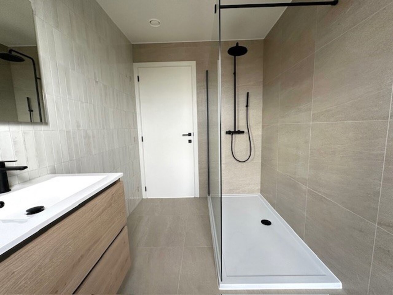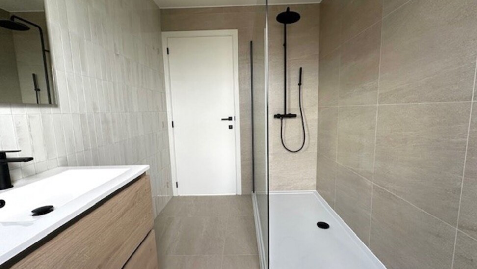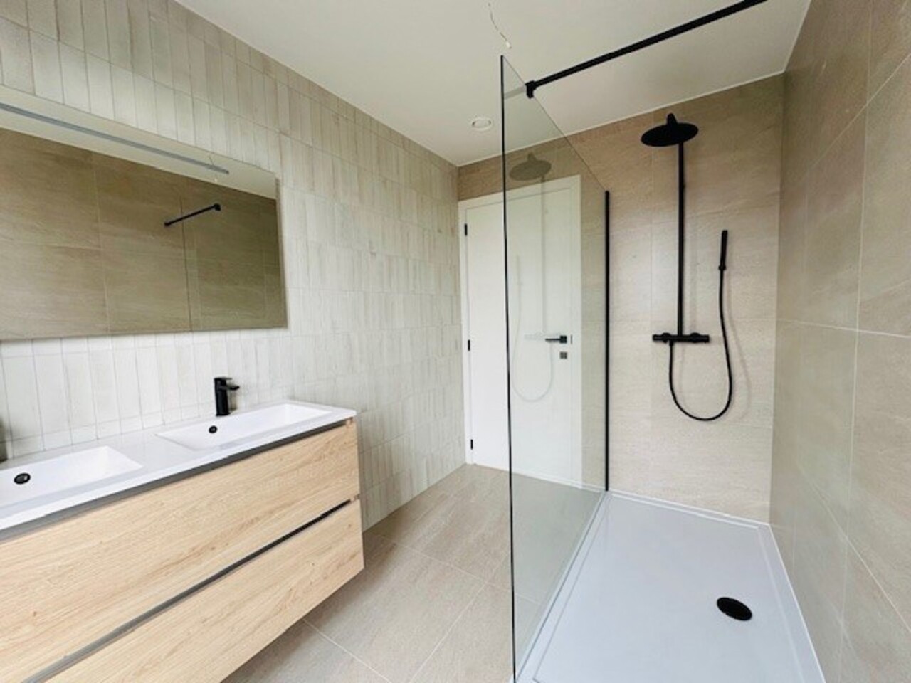 Badkamer wordt voorzien van een badkamermeubel met dubbele wastafel, douchebak met glazen douchewand