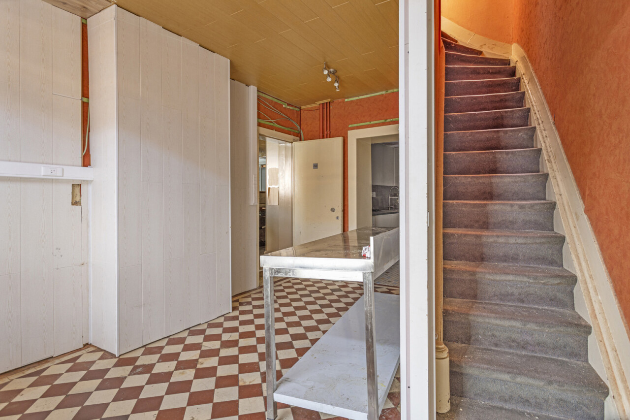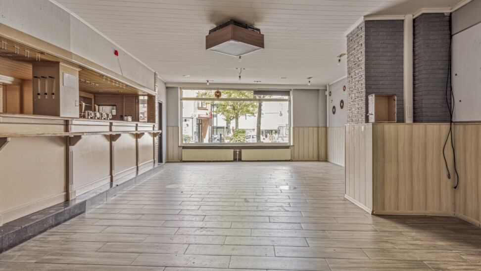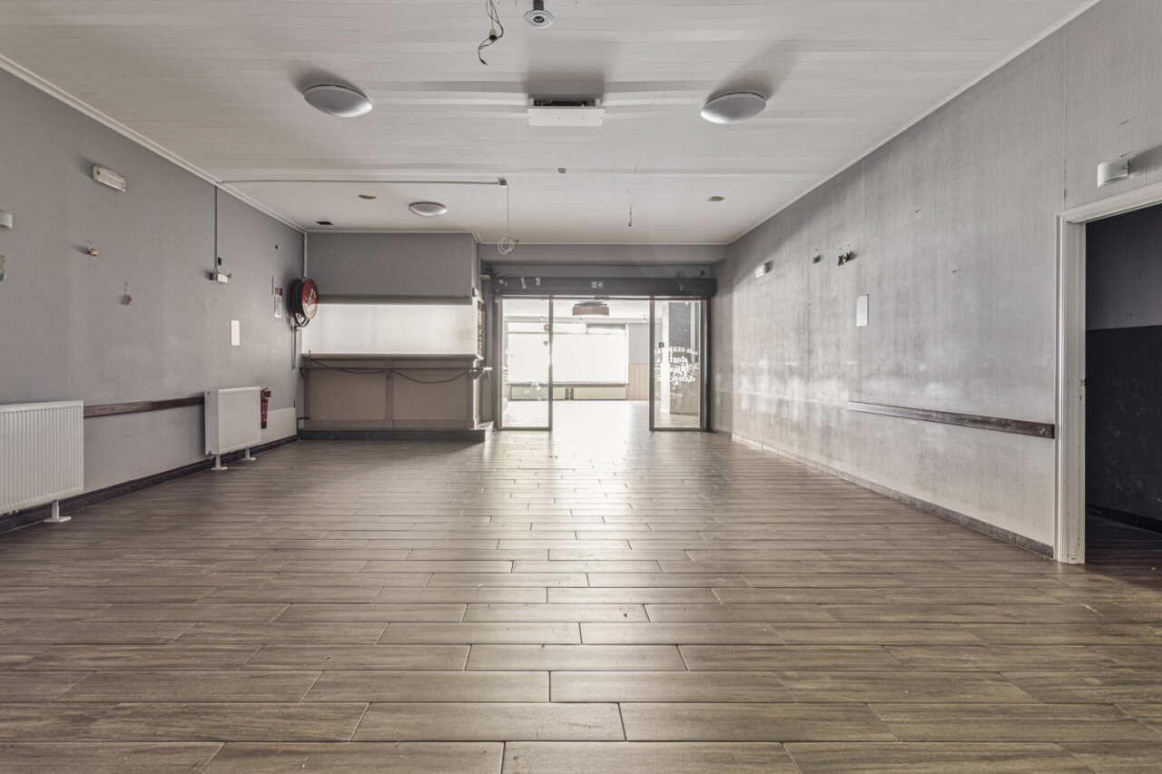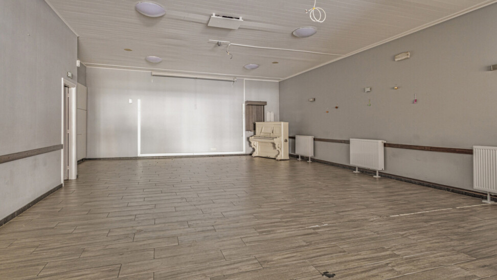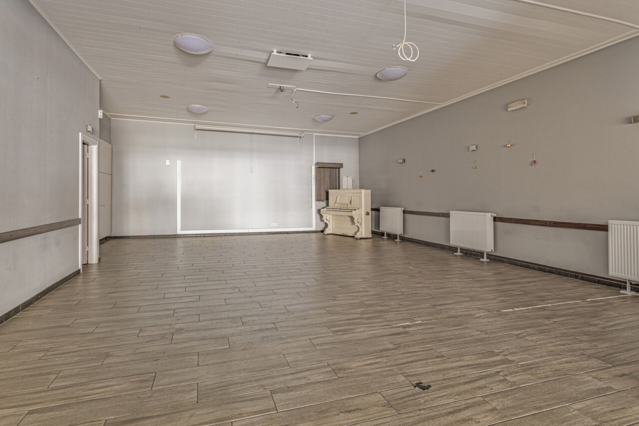 Verbruik/feestzaal: voorzien van een toog en dubbele nooddeur die uitgang biedt via een doorgang naar de straat (erfdienstbaarheid)