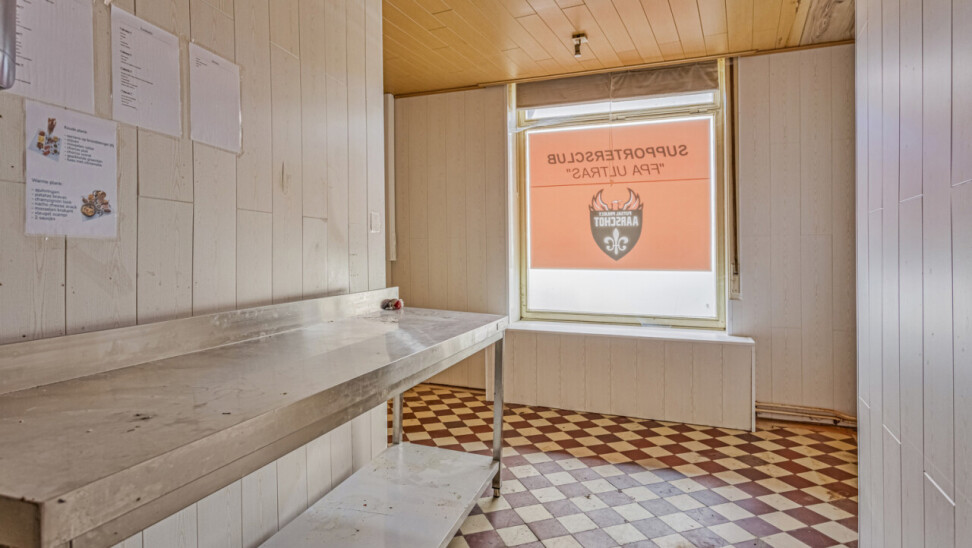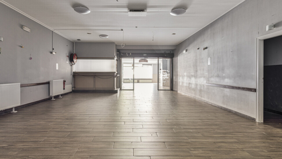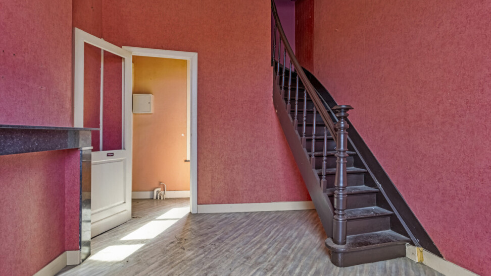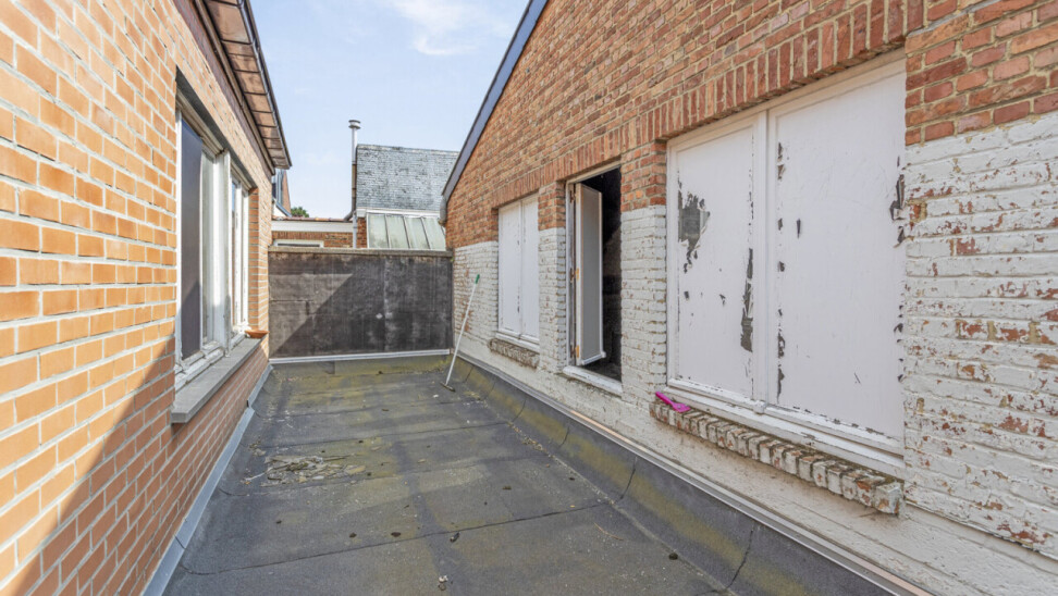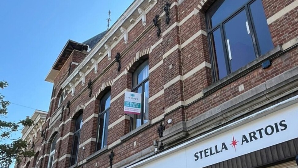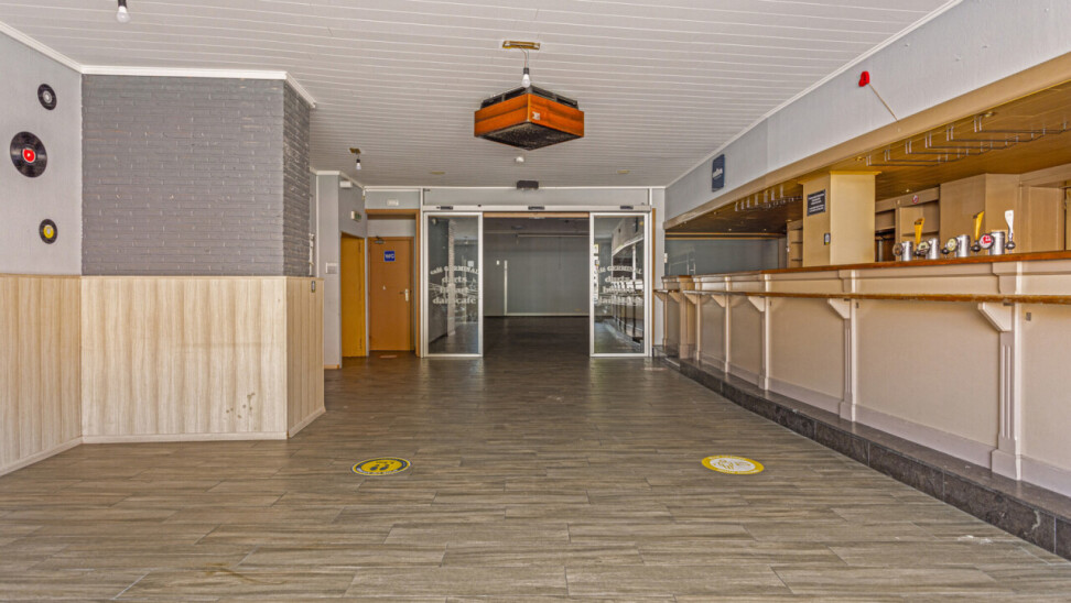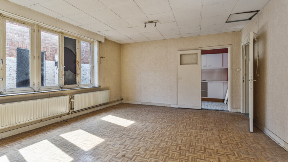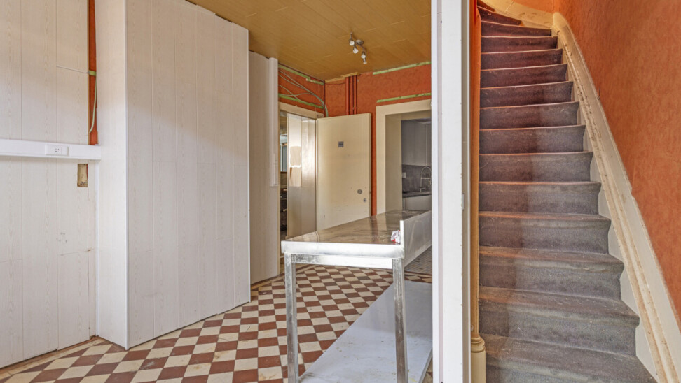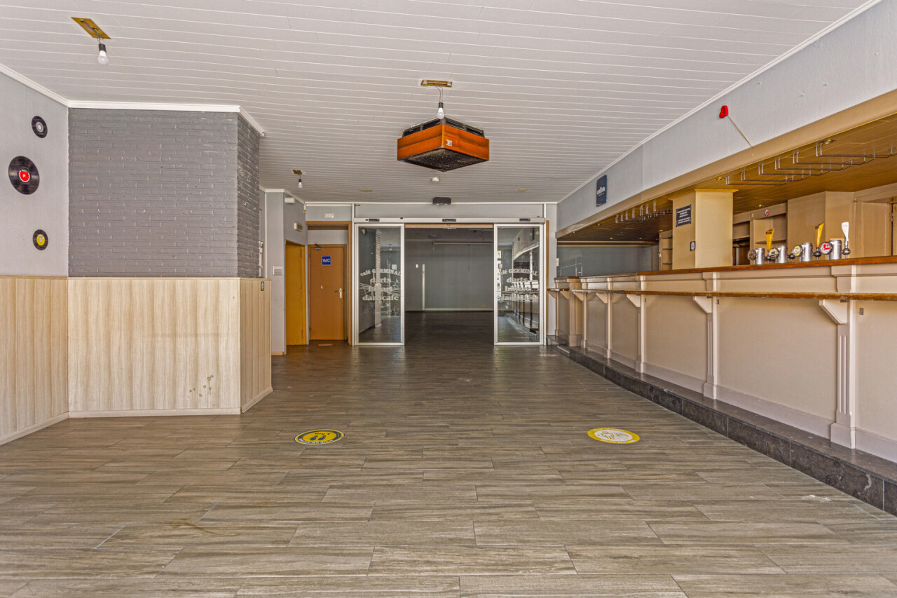 Verbruik/feestzaal: voorzien van een toog en dubbele nooddeur die uitgang biedt via een doorgang naar de straat (erfdienstbaarheid)