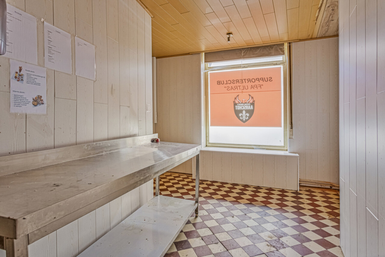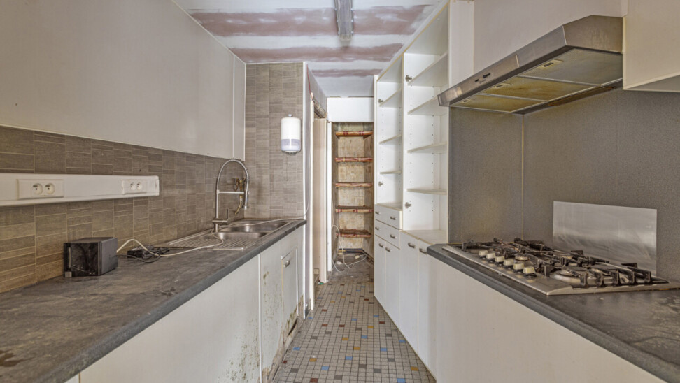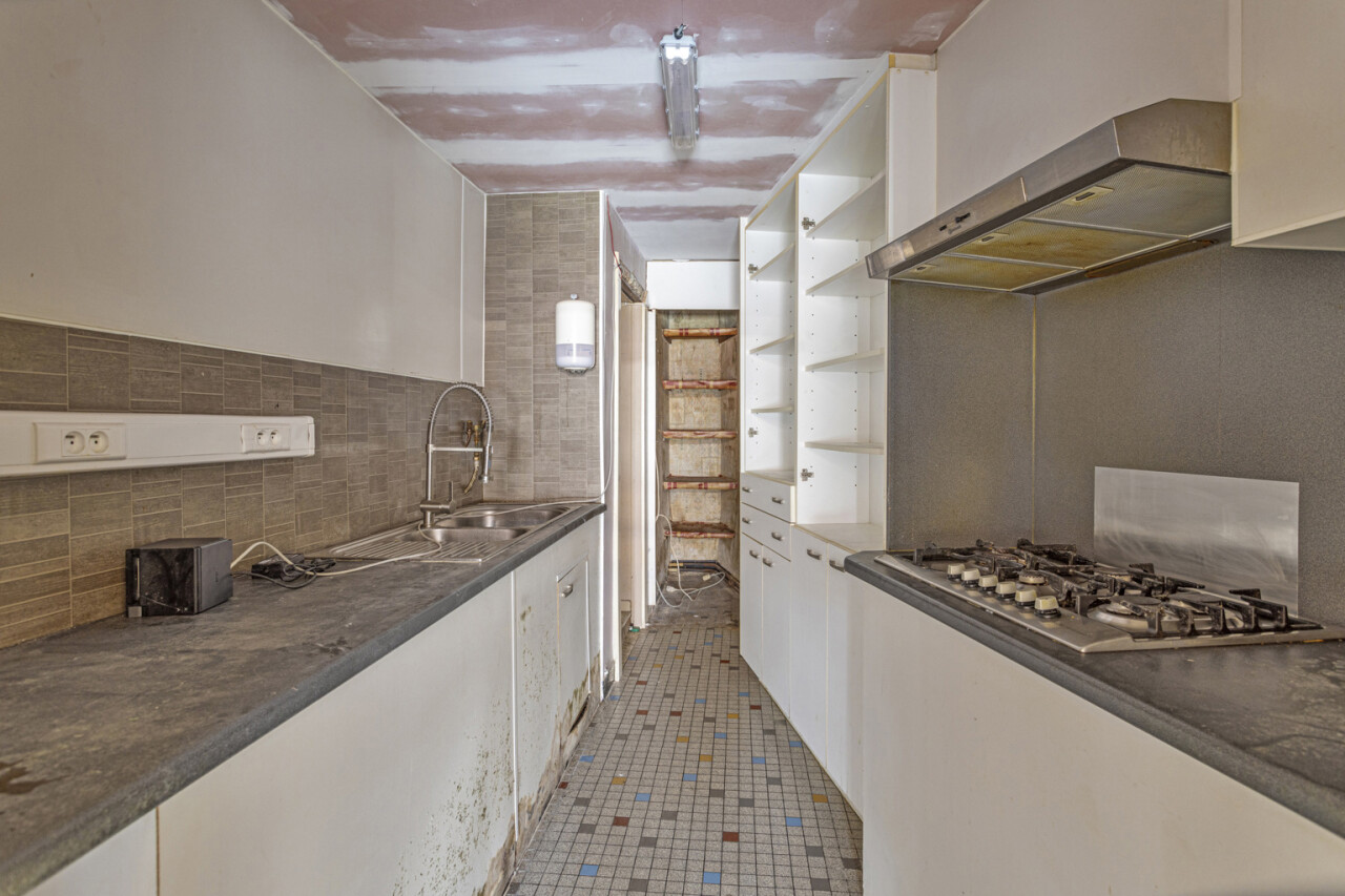 Kitchenette + ruimte achter toog: op tegelvloer, voorzien van een gootsteen en gasfornuis, met toegang tot de kelder en trap naar eerste verdieping