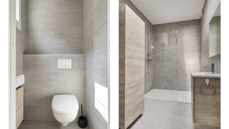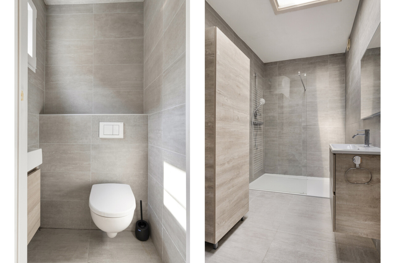 Toilet: 1,3m² op tegelvloer, wanden volledig betegeld en voorzien van een hangtoilet en toiletmeubel met handenwasser
