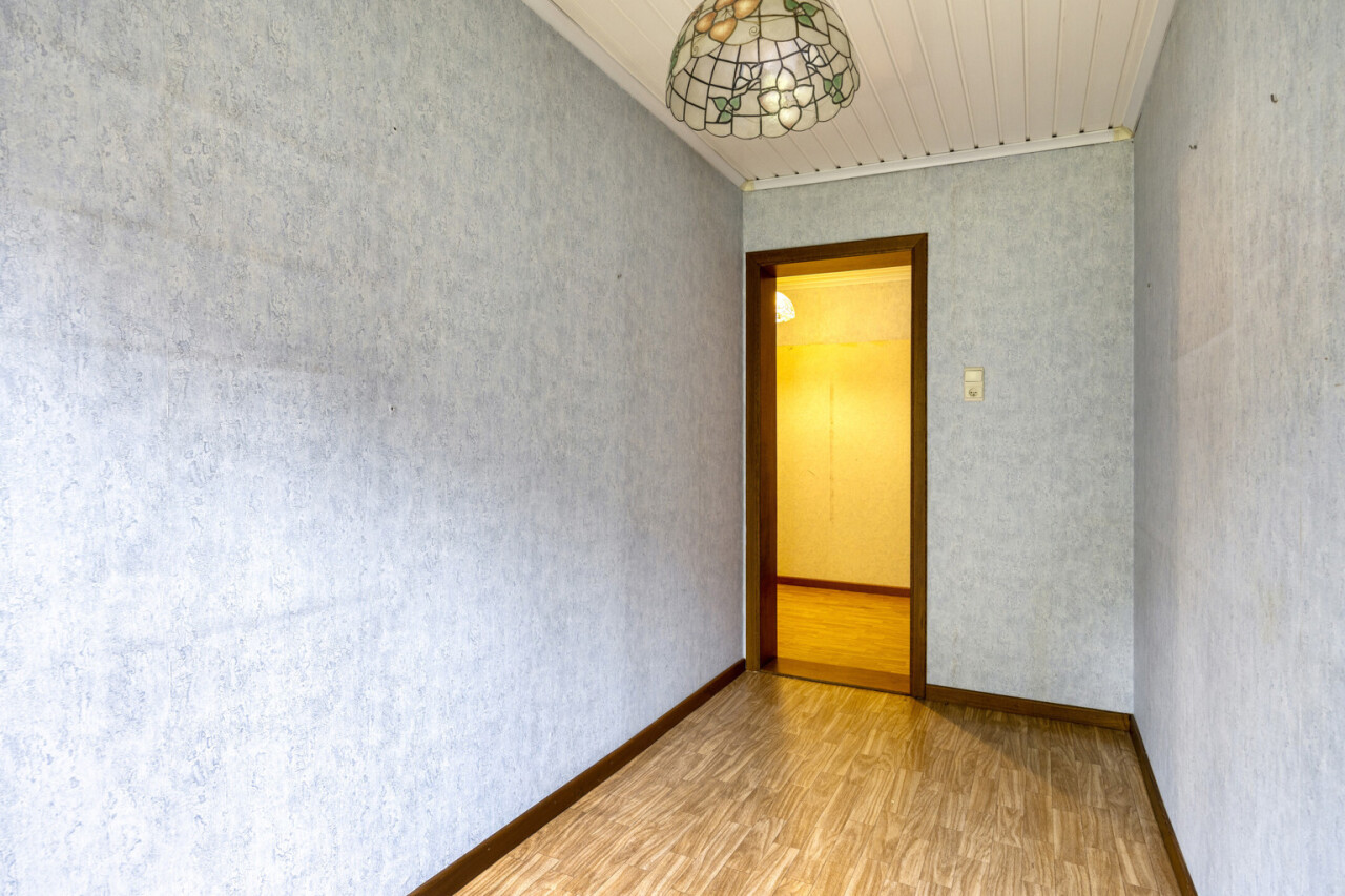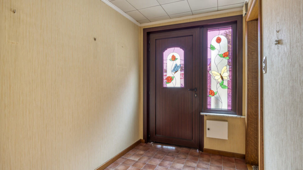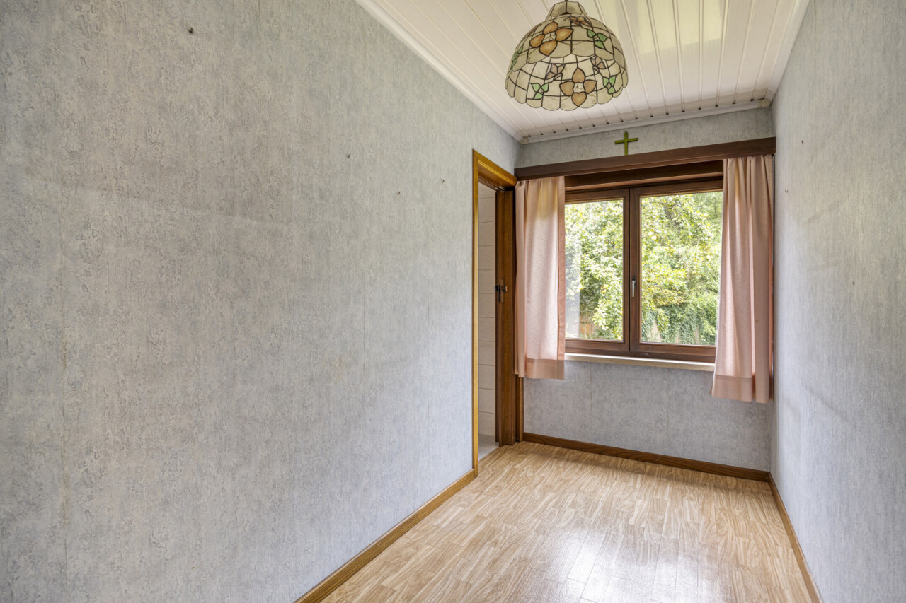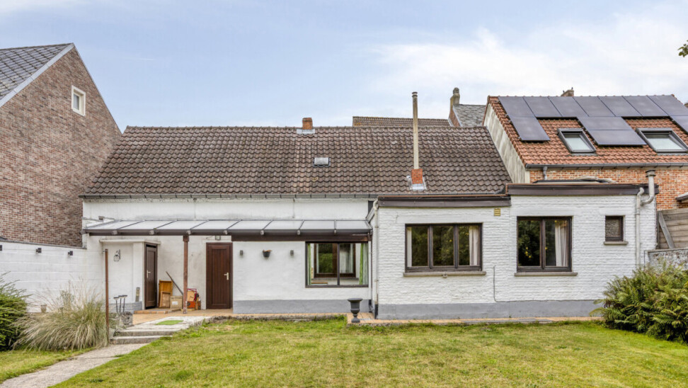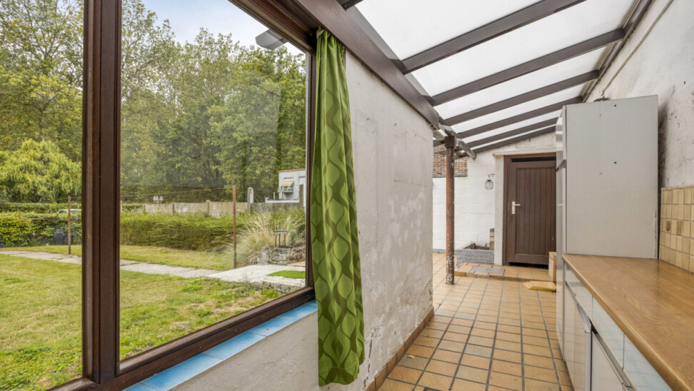 Via de inkomhal betreedt u de centrale leefruimte, die toegang biedt tot een eerste slaapkamer, een hal met extra slaapkamer en badkamer, en een praktische keuken aan de achterzijde. Achteraan bevindt zich bovendien een overdekte veranda die het contact met de tuin versterkt.
