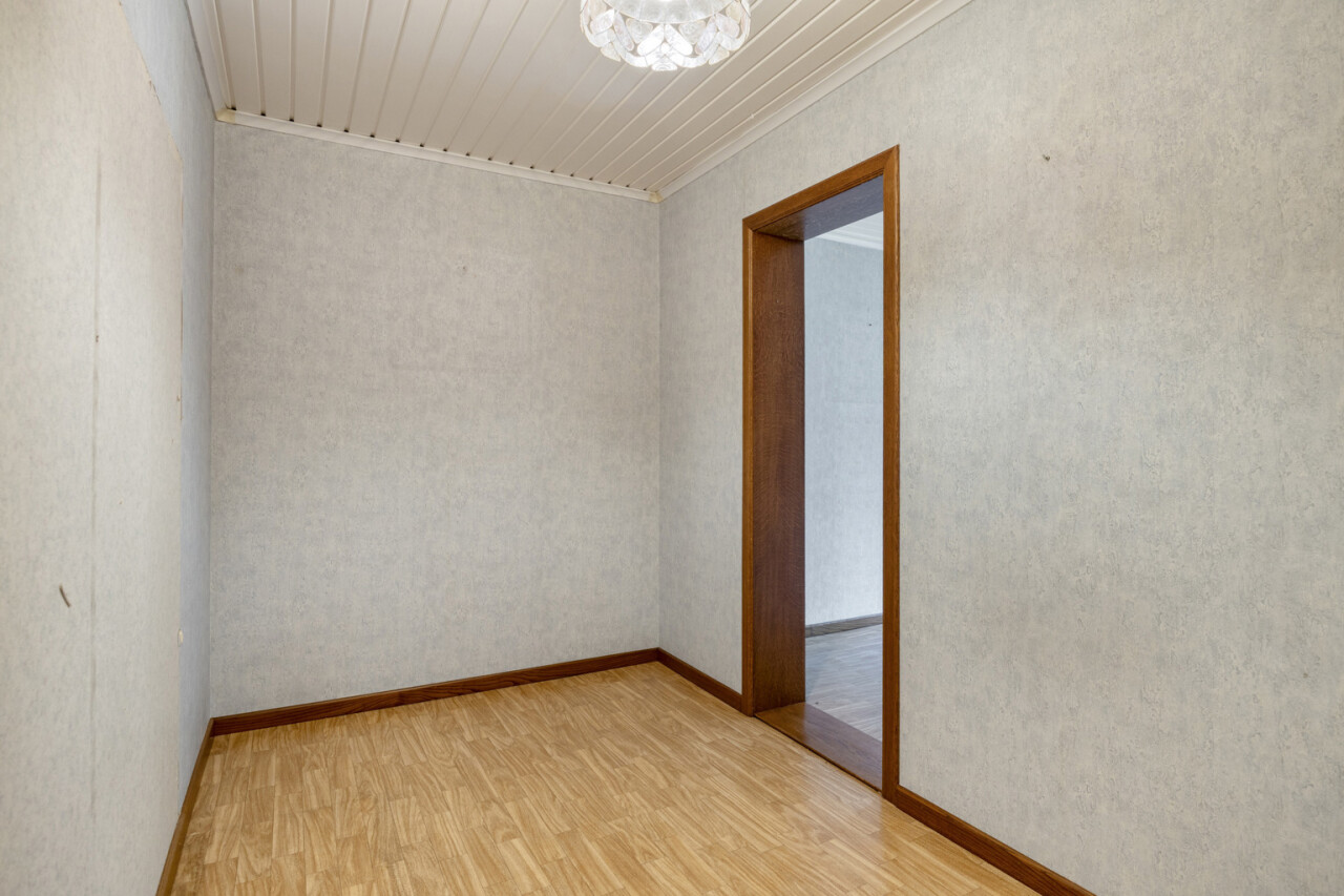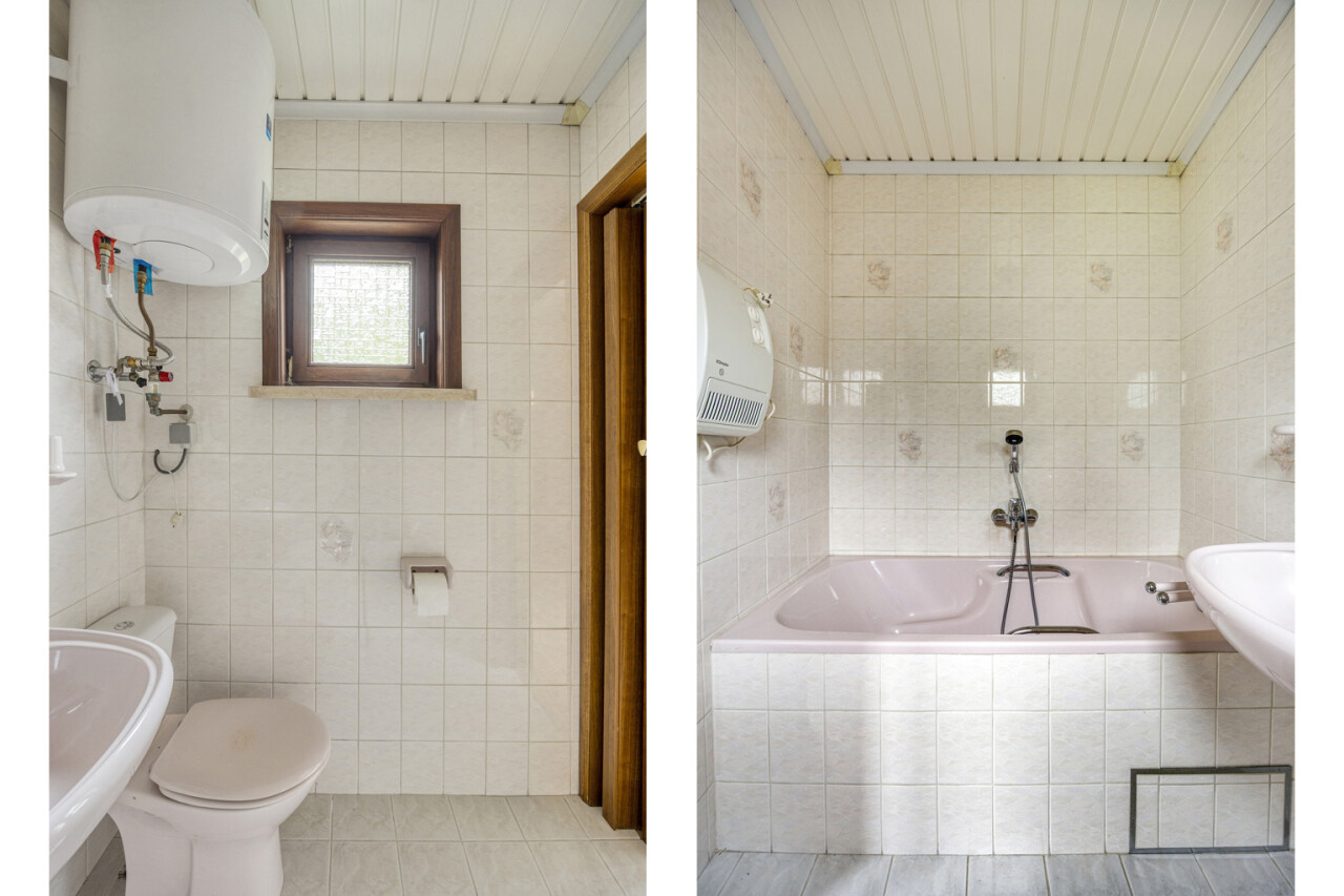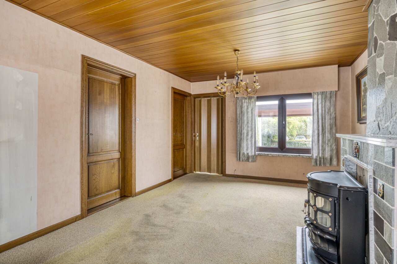 Via de inkomhal betreedt u de centrale leefruimte, die toegang biedt tot een eerste slaapkamer, een hal met extra slaapkamer en badkamer, en een praktische keuken aan de achterzijde. Achteraan bevindt zich bovendien een overdekte veranda die het contact met de tuin versterkt.