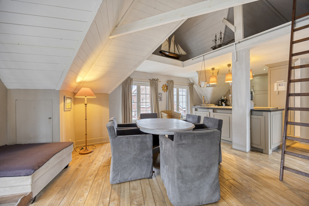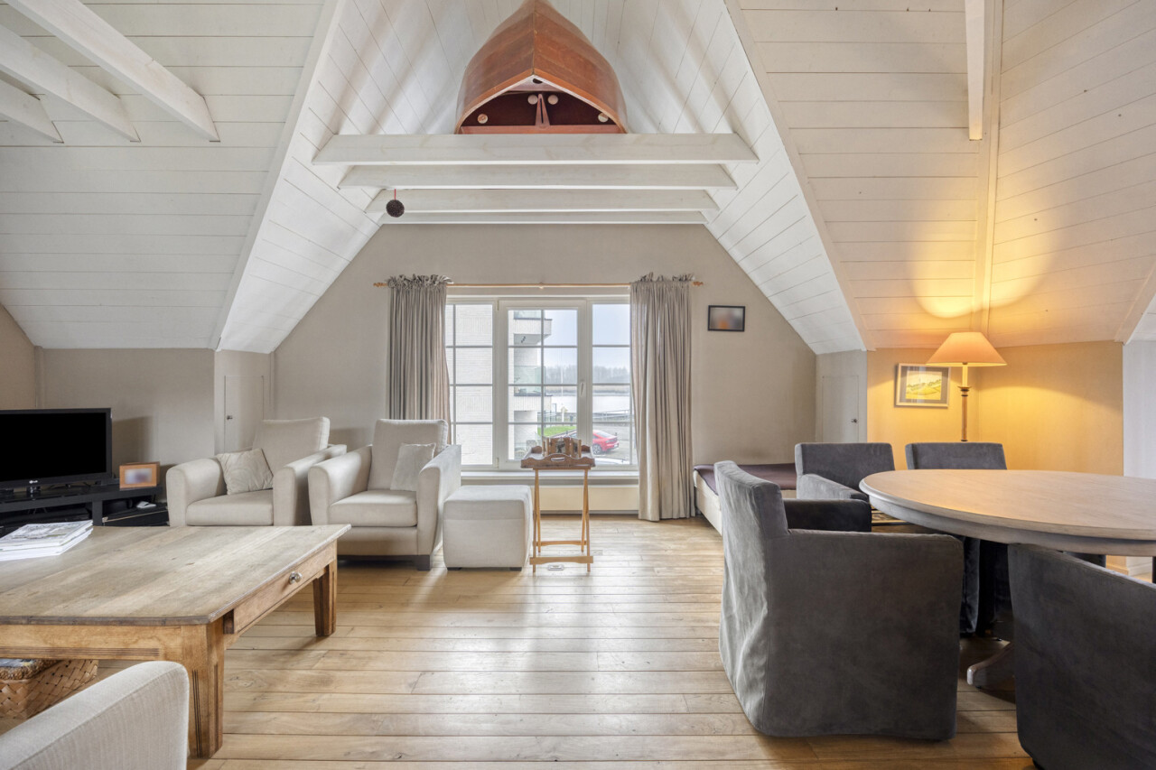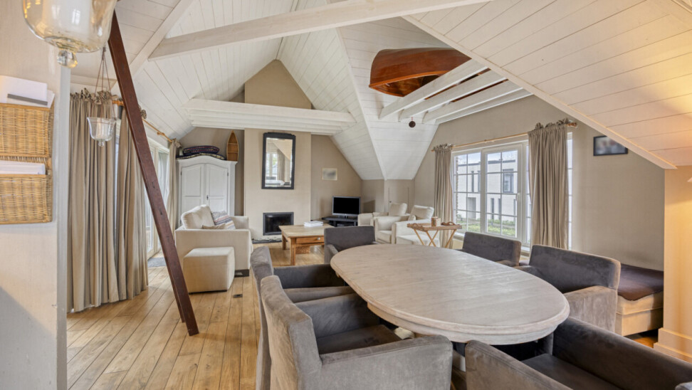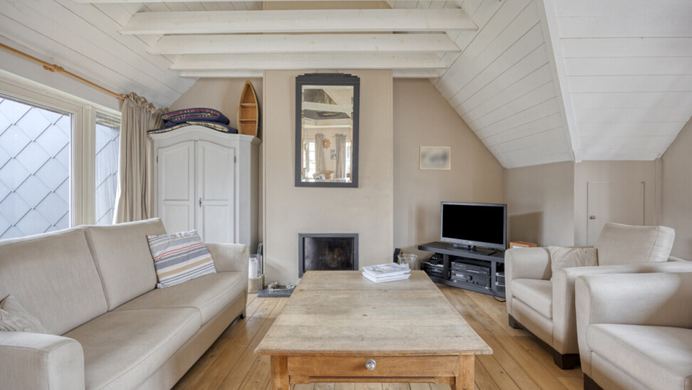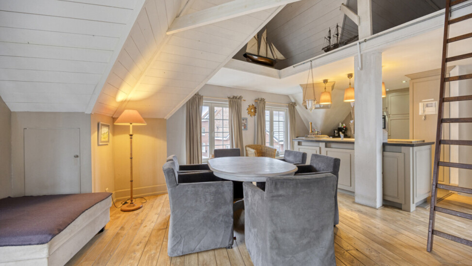 De eerste verdieping vormt het absolute hart van de woning. De lichtrijke leefruimte biedt een open, panoramisch zicht dat een uitgesproken zee- en vakantiegevoel oproept. De geïntegreerde mezzanine is ideaal ingericht als bureau of werkplek, perfect voor thuiswerk in alle rust. De haard zorgt voor extra sfeer en gezelligheid.