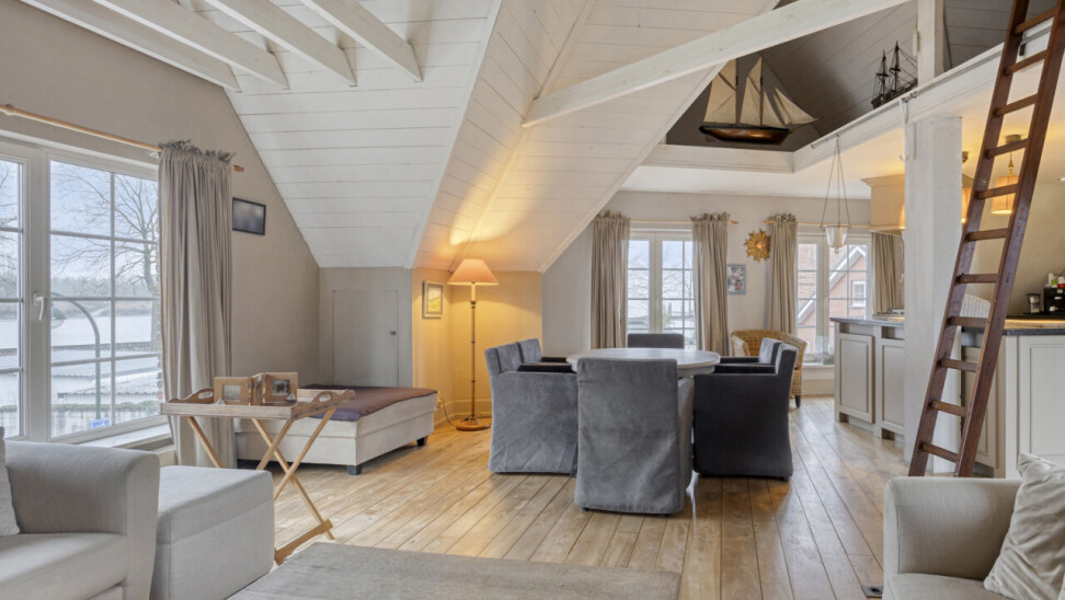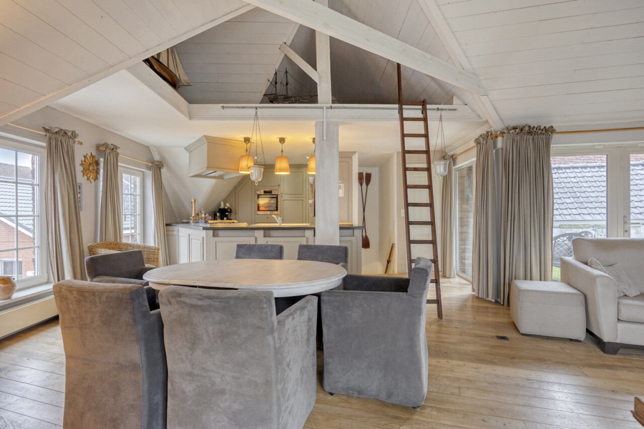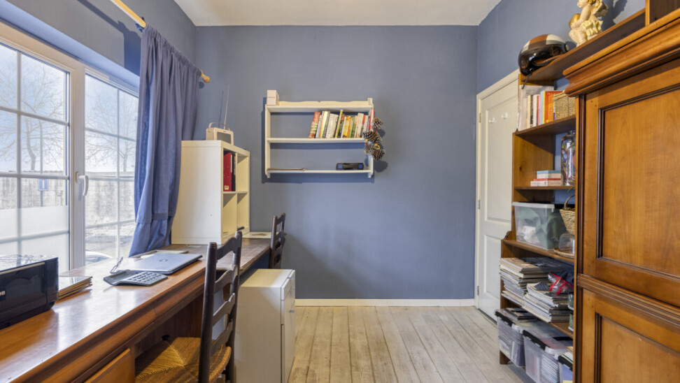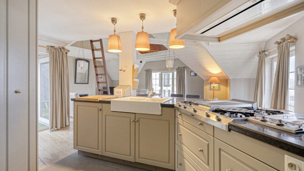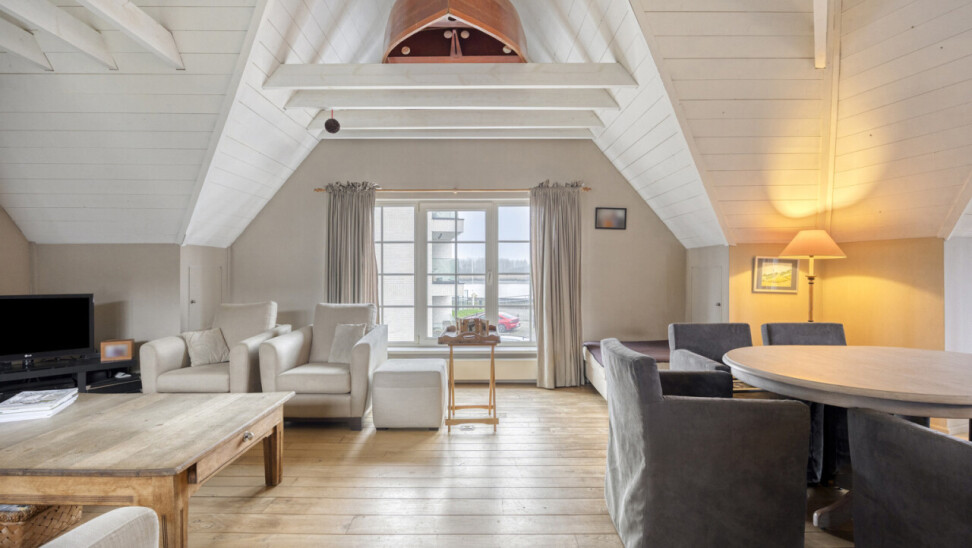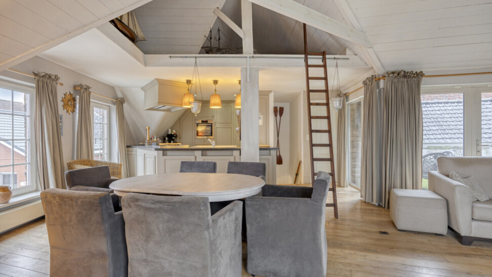 De eerste verdieping vormt het absolute hart van de woning. De lichtrijke leefruimte biedt een open, panoramisch zicht dat een uitgesproken zee- en vakantiegevoel oproept. De geïntegreerde mezzanine is ideaal ingericht als bureau of werkplek, perfect voor thuiswerk in alle rust. De haard zorgt voor extra sfeer en gezelligheid.