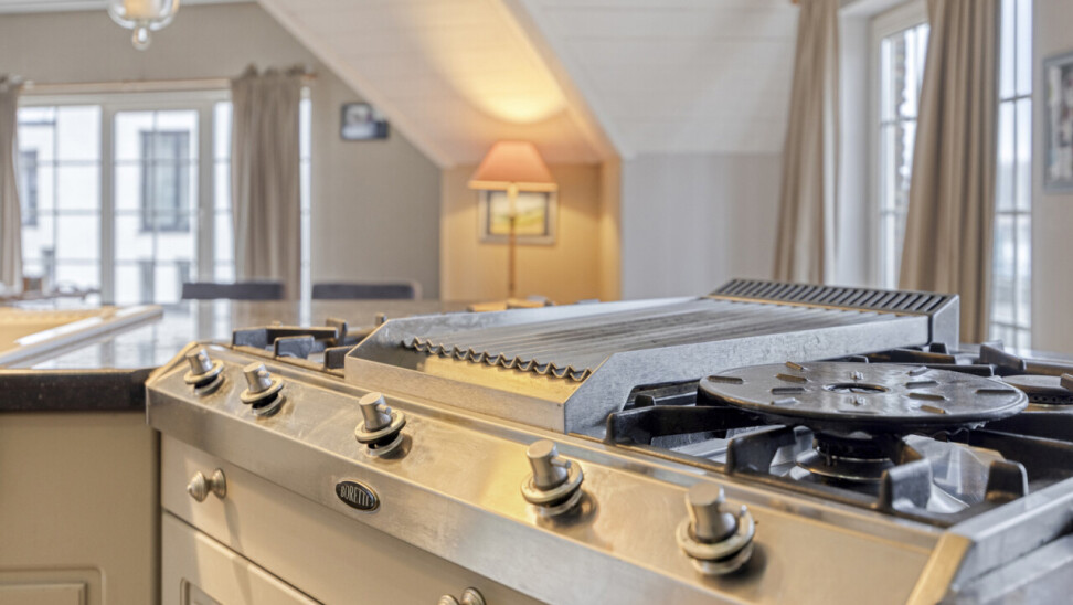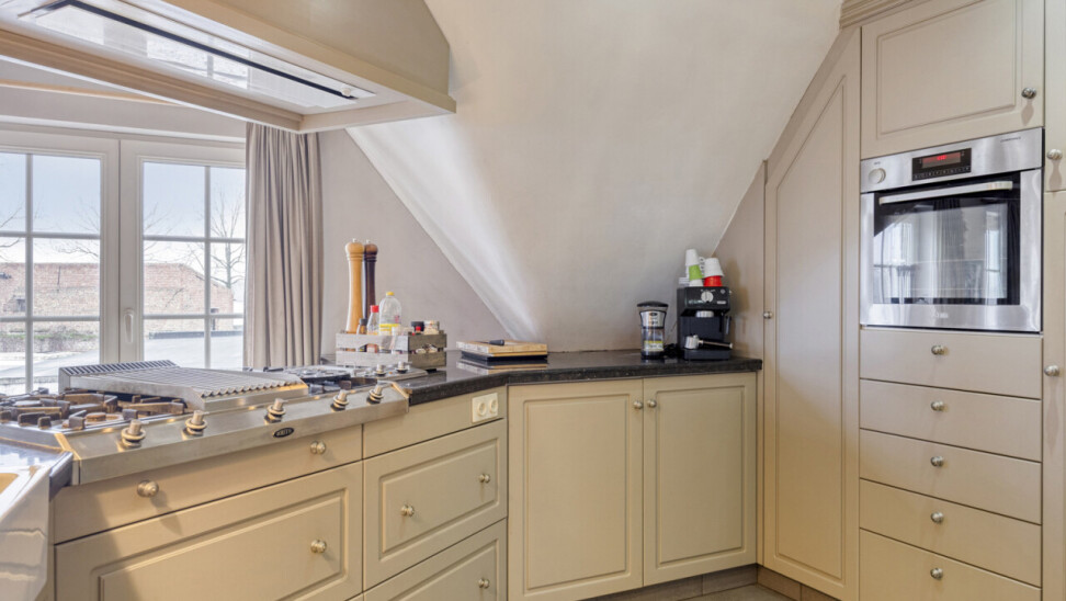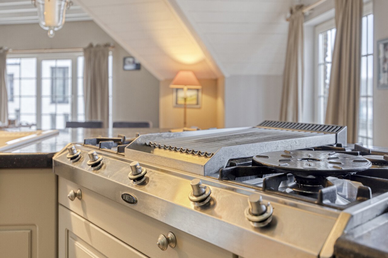 Aansluitend bevindt zich de volledig uitgeruste open keuken, afgewerkt met blauwe hardsteen en voorzien van kwalitatieve toestellen, waaronder: