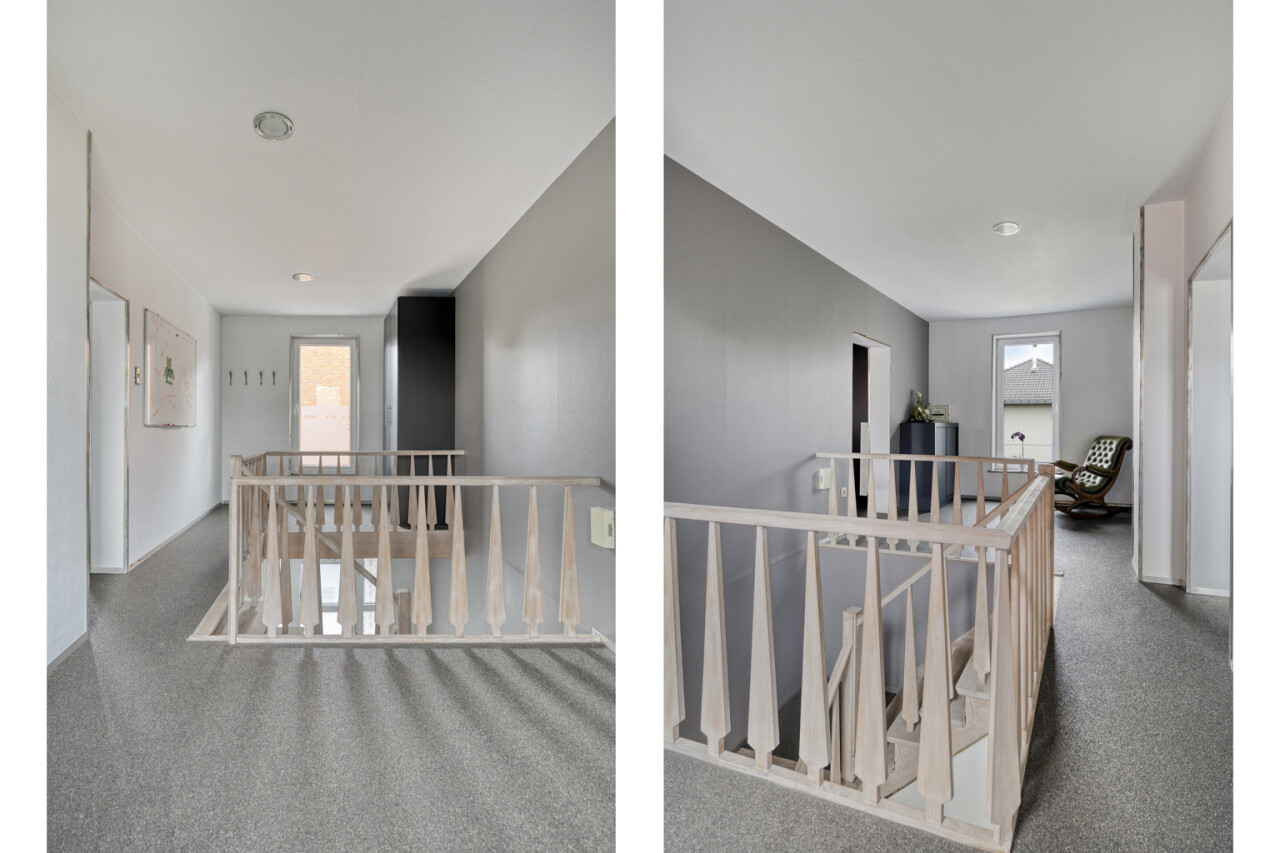 Op de eerste verdieping brengt de royale overloop je naar drie bijzonder ruime kamers, die eenvoudig kunnen ingericht worden als slaapkamers en badkamer.