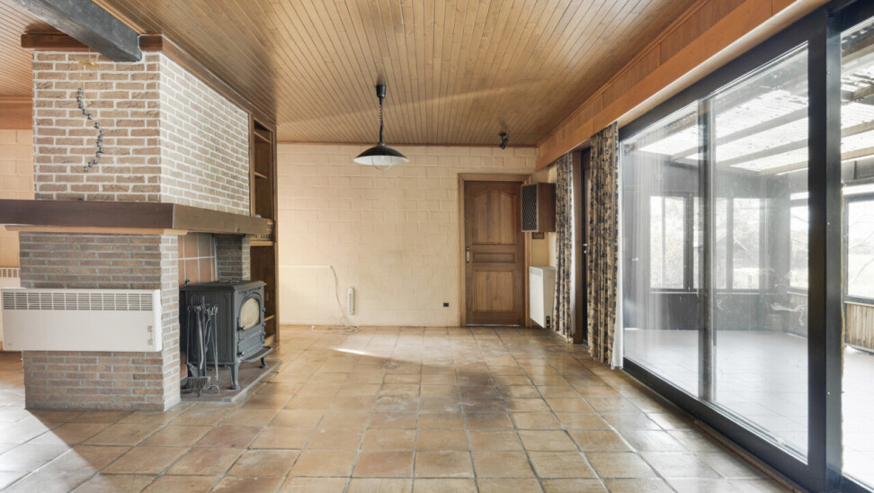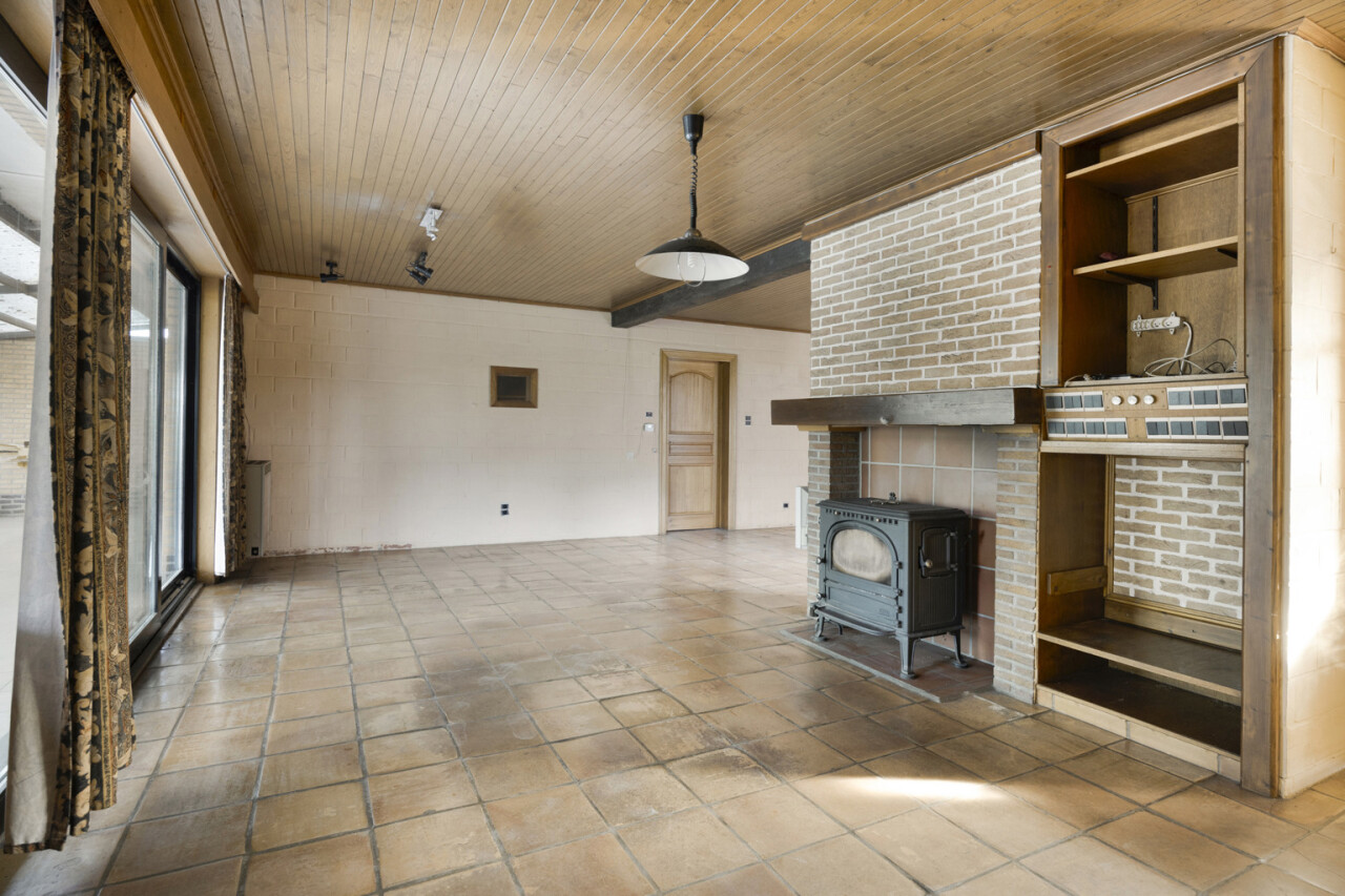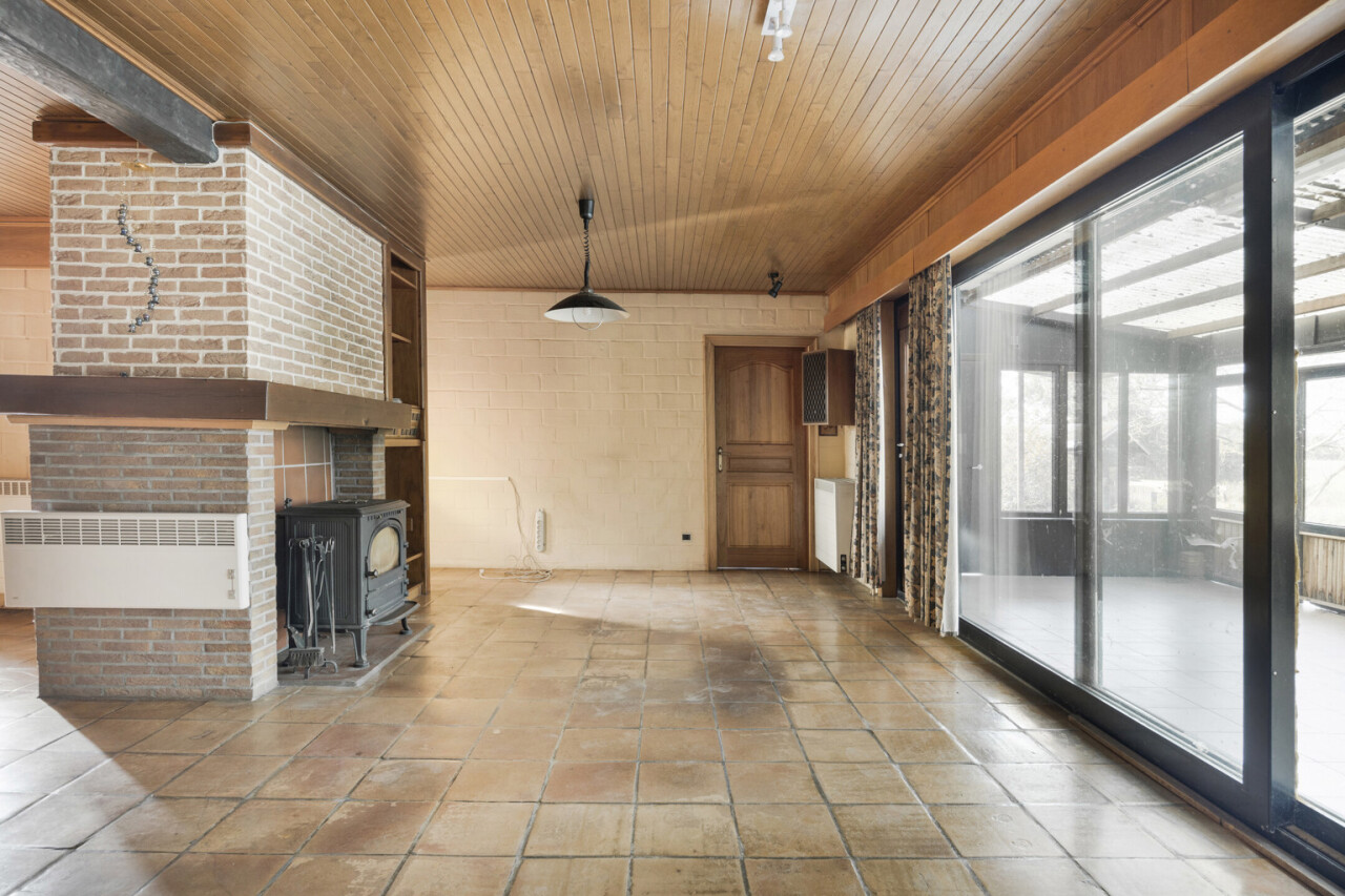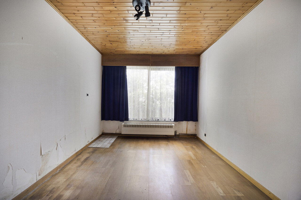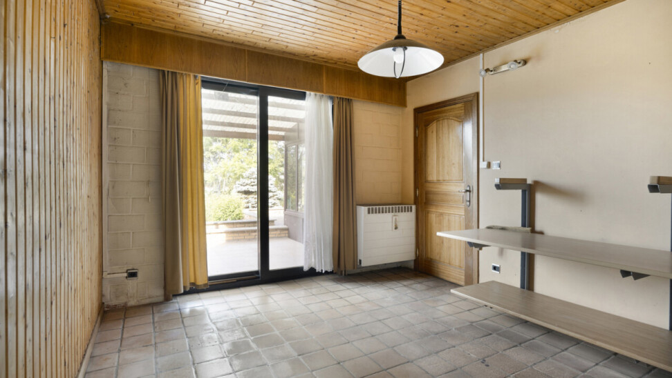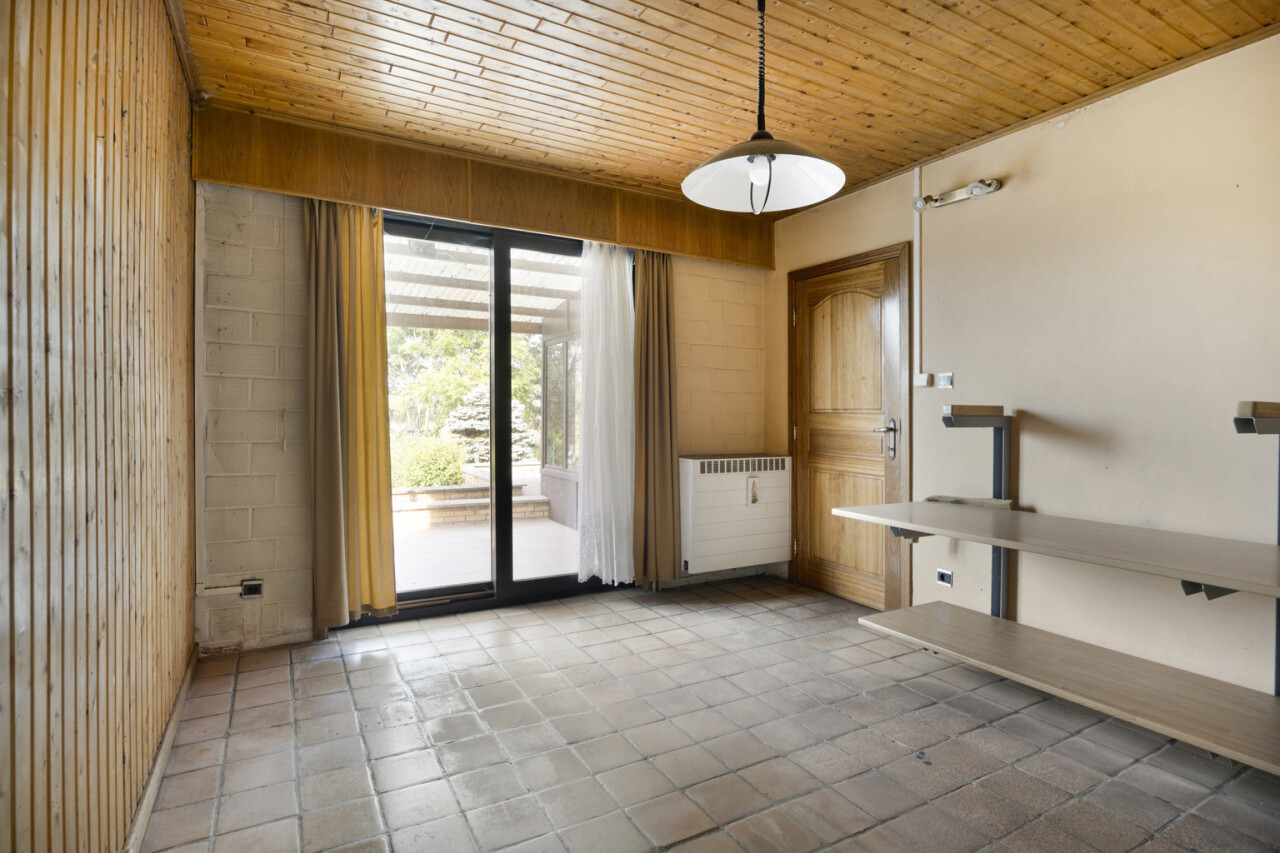 We betreden de woning via de inkomhal met toegang tot het gastentoilet en een praktische ingemaakte kast/dressing. Vervolgens komen we in de lichtrijke leefruimte met grote raampartijen die zorgen voor een aangename verbinding met de tuin en veranda. Aansluitend bevindt zich een kamer die perfect kan dienen als bureau of extra slaapkamer.