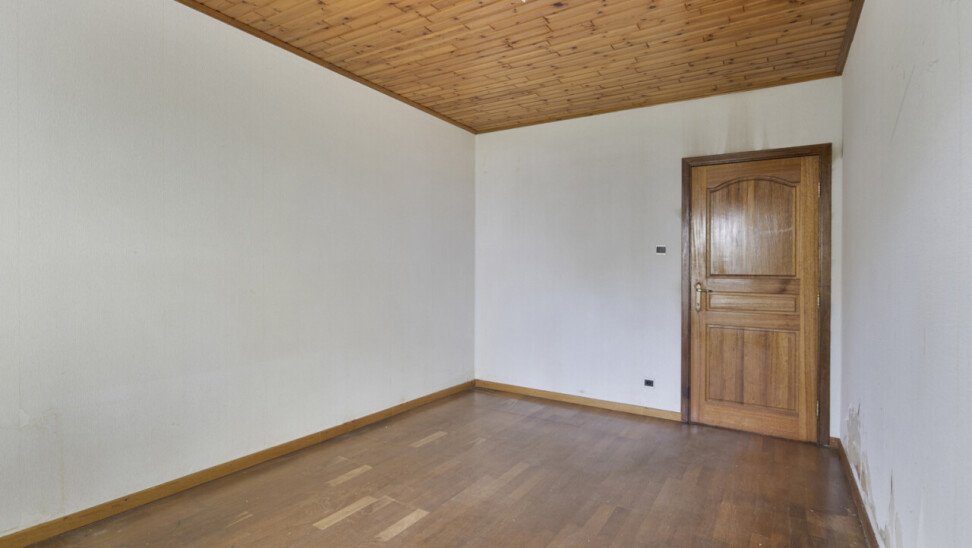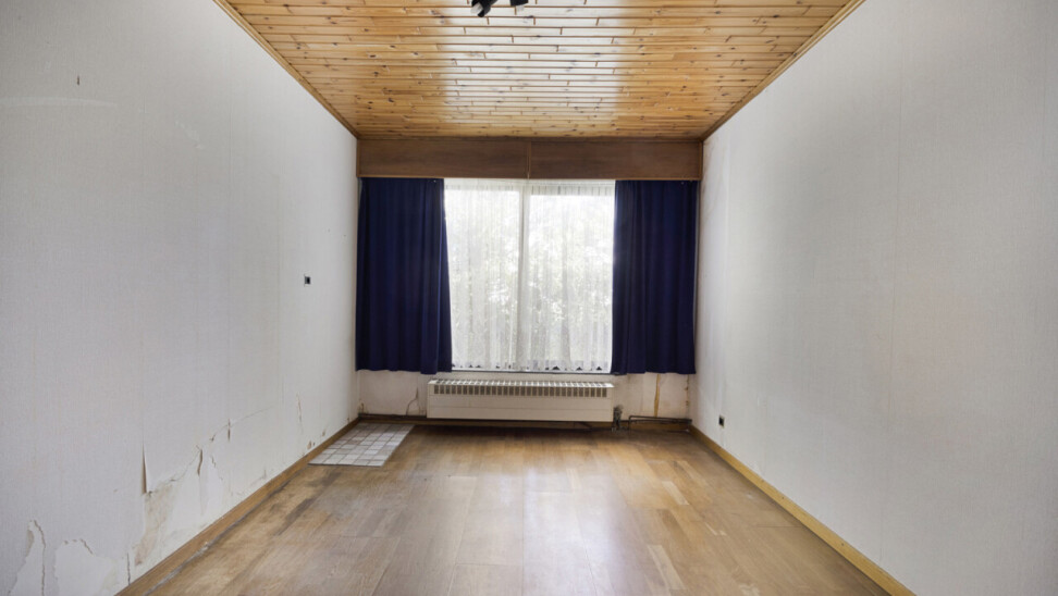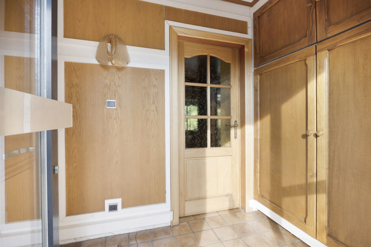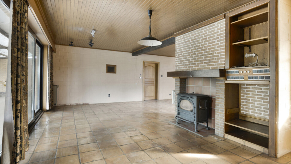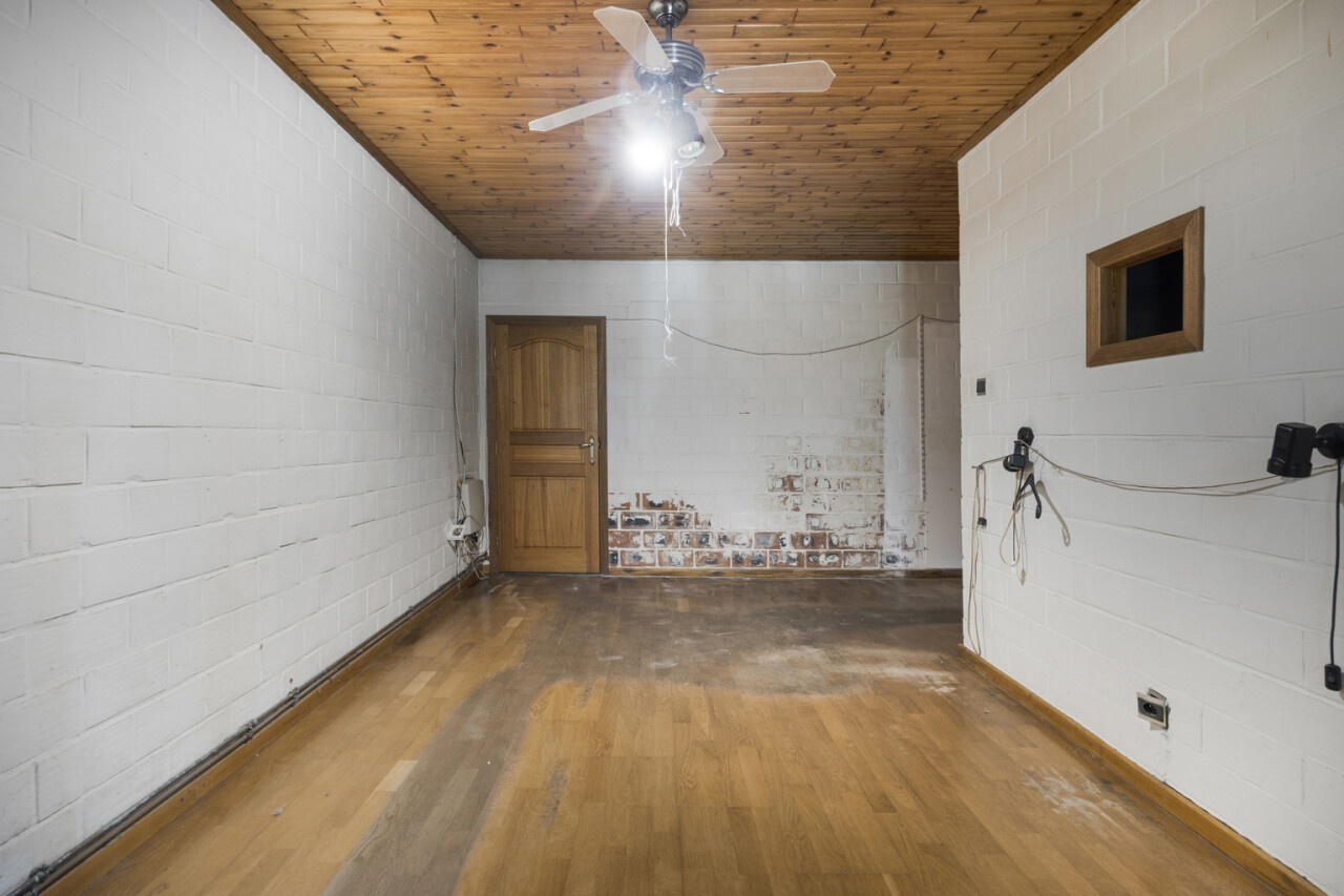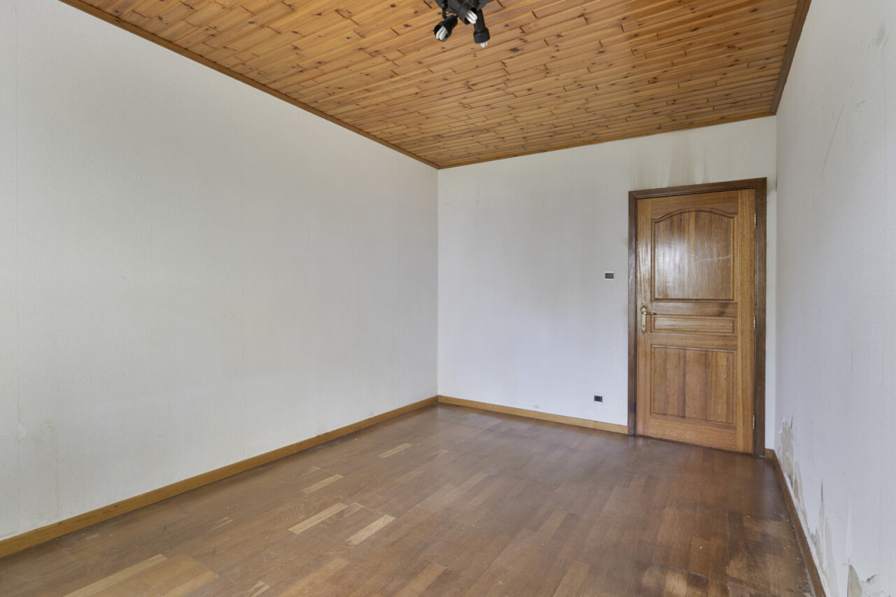 We betreden de woning via de inkomhal met toegang tot het gastentoilet en een praktische ingemaakte kast/dressing. Vervolgens komen we in de lichtrijke leefruimte met grote raampartijen die zorgen voor een aangename verbinding met de tuin en veranda. Aansluitend bevindt zich een kamer die perfect kan dienen als bureau of extra slaapkamer.